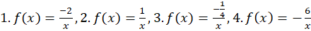 Wykres funkcji postaci przechodzi przez punkt (1, a). Zauważ, że funkcja A (niebieska) przechodzi przez punkt (1, 1), czyli a=1, więc jej wzór to . Funkcja B (fioletowa) przechodzi przez punkt . Funkcja C (czerwona) przechodzi przez punkt (1, -6), czyli a=-6, więc jej wzór to . Funkcja D (żółta) przechodzi przez punkt (1, -2), czyli a=-2, więc jej wzór to .