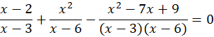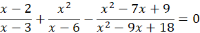 Wyznacz dziedzinę, wiedząc, że mianownik musi być różny od zera. Sprowadź ułamki do wspólnego mianownika. Przyrównaj do siebie liczniki, wiedząc, że ułamki o tych samych mianownikach są równe wtedy i tylko wtedy, gdy mają równe liczniki. Wyznacz rozwiązania, rozkładając wielomian na czynniki i sprawdź, czy należą do dziedziny.