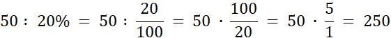 Żeby obliczyć liczbę, jeśli znamy jej procent, najpierw zamieniamy procent na ułamek. Procent to ułamek, który w liczniku ma liczbę procent, a w mianowniku liczbę 100. Następnie dzielimy liczbę przez powstały ułamek. Liczba, której 20% to 50: