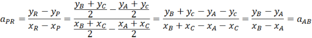 Współczynniki kierunkowe prostych mają takie same wartości, zatem odcinek, który łączy środki dwóch boków danego trójkąta jest równoległy do trzeciego z boków, co kończy dowód.