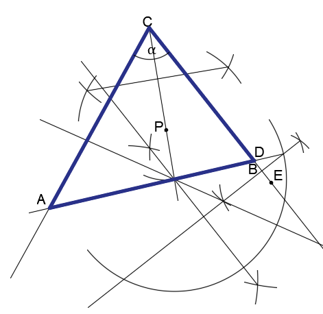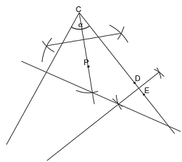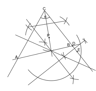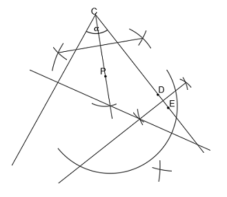 Zakreśl łuk o dowolnej rozwartości z łuku na prostej CP, przecięć tego łuku z symetralną odcinka DE zakreśl kolejne dowolne łuki