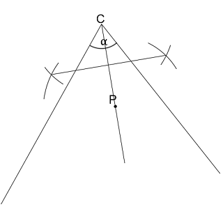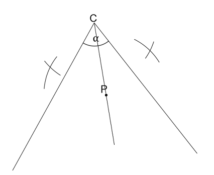 Wykreśl łuk z punktu P o promieniu równym odległości od P do przecięcia się prostych. Tą samą rozwartością wykreśl łuki z dowolnych punktów na ramieniu kąta.