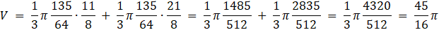 W wyniku takiego obrotu powstają dwa stożki o tworzących odpowiednio 2 i 3 i promieniom równym wysokości trójkąta: