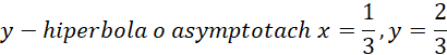 W pierwszej kolejności sprowadzamy równanie do postaci kanonicznej, na podstawie której możemy odczytać asymptoty hiperboli, następnie sporządzimy pomocniczy rysunek. Z rysunku widzimy, że dla dowolnej prostej