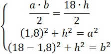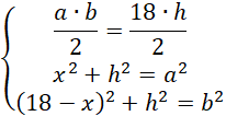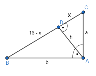 Przeciwprostokątna trójkąta prostokątnego ABC ma długość 18. Oblicz długość przyprostokątnych tego trójkąta, mając wiedzę, że wysokość AD podzieliła trójkąt na dwa trójkąty, z których pole jednego jest 9 razy większe od pola drugiego.