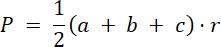 . Oblicz pole jako połowa iloczynu obwodu trójkąta i promienia okręgu wpisanego w ten trójkąt. Obwód trójkąta oblicz za pomocą obliczonej sumy długości boków