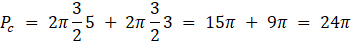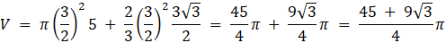 W wyniku obrotu równoległoboku o bokach 3 cm i 5 cm i kącie ostrym 30°, dookoła dłuższego boku powstała bryła. Wyznacz jej objętość coraz pole powierzchni.