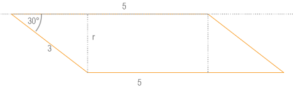 W wyniku obrotu równoległoboku o bokach 3 cm i 5 cm i kącie ostrym 30°, dookoła krótszego boku powstała bryła. Wyznacz jej objętość coraz pole powierzchni.