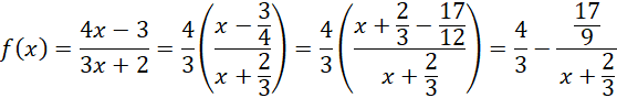 Najpierw sprowadzamy równanie do postaci kanonicznej, poprzez rozdzielenie licznika i podzielenie przez mianownik. Zbiór wartości odczytujemy z postaci kanonicznej, gdyż jest to zbiór liczb rzeczywistych z wyjątkiem asymptoty poziomej. Przedziały monotoniczności odczytujemy przy pomocy współczynnika