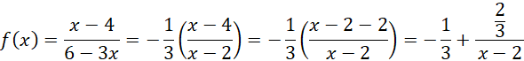 Najpierw sprowadzamy równanie do postaci kanonicznej, poprzez rozdzielenie licznika i podzielenie przez mianownik. Zbiór wartości odczytujemy z postaci kanonicznej, gdyż jest to zbiór liczb rzeczywistych z wyjątkiem asymptoty poziomej. Przedziały monotoniczności odczytujemy przy pomocy współczynnika