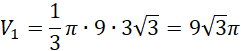 Skorzystaj z twierdzenia Pitagorasa, aby wyznaczyć potrzebne wartości. Oblicz objętość mniejszego stożka, a następnie za pomocą skali oblicz objętość większej bryły.