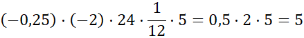 Pamiętaj, iloczyn liczb ujemnych jest dodatni, a iloczyn liczby dodatniej i ujemnej – ujemny. Pomnóż ze sobą (–0,25) i (–2) oraz 24 i jedną dwunastą. Następnie wykonaj mnożenie otrzymanych wyników i liczby 5. Zauważ, że iloczyn 5 i 2 jest równy 10: przesuń przecinek w ułamku o jedno miejsce w prawo.