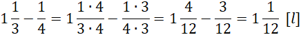 Odejmij odlaną część od ilości wody, która była w naczyniu. Sprowadź ułamki do wspólnego mianownika, mnożąc licznik i mianownik przez tę samą liczbę, aby móc wykonać odejmowanie.