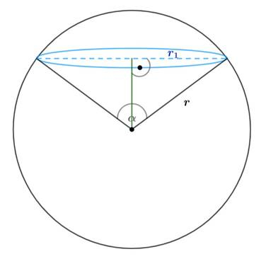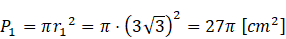 Z rysunku odczytaj, że trójkąt o bokach r i r1 jest trójkątem szczególnym o kątach 30°, 60°, 90°. Na podstawie jego własności wyznacz długości promienia przekroju koła (r1), a następnie oblicz jego pole (P1).