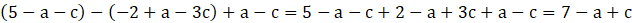 Aby uprościć wyrażenie, musisz pozbyć się nawiasów nawiasy (każdą liczbę w nawiasie musisz przemnożyć przez liczbę poza nawiasem, pamiętając, że jeżeli przed nawiasem stoi + to nie zmienia on znaku, jeżeli przed nawiasem stoi – to zmienia on znaki). Następnie musisz zredukować wyrazy podobne, czyli dodać podobne do podobnego, odjąć podobne od podobnego. Na koniec do zredukowanego wyrażenia, za a i c wstaw podane liczby i policz wynik.