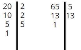 W rozkładach obu liczb występuje jednocześnie liczba 5, stąd NWD(20, 65) = 5.