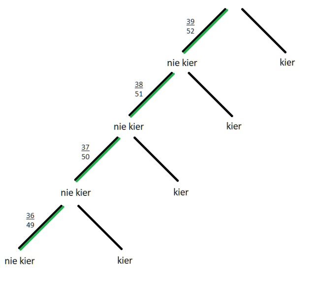 Ponieważ doświadczenie losowe jest wieloetapowe, w tym zadaniu musisz narysować drzewko. Każdy poziom drzewka będzie odpowiadał kolejnemu losowaniu. Możesz wylosować albo kiera, albo kartę, która nie jest kierem i te przypadki zaznaczasz jako gałęzie. Wylosowanie jakiejkolwiek karty będącej kierem na którymkolwiek etapie powoduje niespełnienie zdarzenia losowego, więc nie musisz rysować gałęzi, które wychodzą od kierów. Prawdopodobieństwo wylosowania innej karty niż kier obliczysz korzystając z klasycznej definicji prawdopodobieństwa, dzieląc ilość innych kart niż kier przez wszystkie karty. Pamiętaj, że gdy wylosujesz jedną kartę, ich ilość zmniejsza się o tę wylosowaną kartę. Gdy już narysujesz drzewo zaznacz te zdarzenia, których prawdopodobieństwo będziesz liczył oraz wszystkie gałęzie po drodze. Następnie przemnóż przez siebie prawdopodobieństwa na poszczególnych gałęziach.