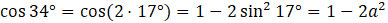 Wiedząc, że sin 17° = a, wyznacz wartość cos 34°.