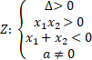 Aby funkcja kwadratowa miała dwa różne rozwiązania ujemne to: współczynnik kierunkowy musi być różny od zera, delta musi być większa od zera i iloczyn pierwiastków musi być dodatni.