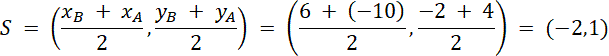 W tym zadaniu dane są punkty A i B. Musisz wyznaczyć współrzędne środka S odcinka AB trzema sposobami: 1) ze wzorów, 2) z równości wektorów