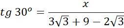 Dwukrotnie skorzystaj z funkcji tangens, aby wyznaczyć długość brakującej podstawy w podanym trójkącie, a następnie szukanego odcinka