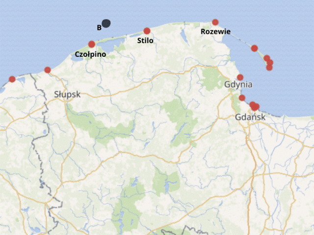 W tym zadaniu musisz znaleźć na mapie punktem B miejsce, gdzie znajdował się statek, z którego na azymut 100° widać Stilo, a na azymut 210° latarnię Czołpino.