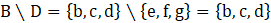 Zbiór B nie ma części wspólnej ze zbiorem D, ponieważ mają wszystkie elementy różne, przez co nie ma czego odrzucić ze zbioru B. Wszystkie elementy zbioru B nie należą do zbioru D.