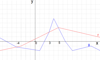 Dal oby dwu funkcji dziedziną jest zbiór liczb rzeczywistych. Natomiast wartości funkcji g mają być większe w określonym przedziale, ale tylko w określonym przedziale od funkcji f co oznacza, że wykresy funkcji muszą się przeciąć w punktach określonych przez granice przedziałów