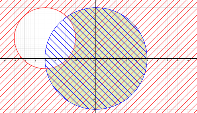 Z drugiego równania możesz odczytać, że okrąg będzie miał środek o współrzędnych (-5, 2) (pamiętaj o zmianie znaków współrzędnych przy odczycie na przeciwne) oraz promień wynoszący 3. Ponieważ jest znak większości lub równości, to zaznacz obszar na zewnątrz okręgu razem z samym okręgiem.