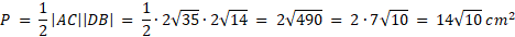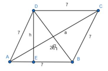 Oblicz wysokość i pole rombu, którego bok ma długość 7 cm i krótsza przekątna ma długość 2√14 cm.