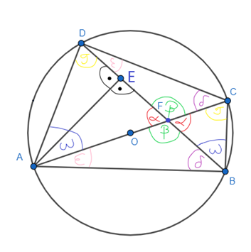Kąty ACD i DBA to kąty wpisane oparte na tym samym łuku AD, wiec mają tą samą wartość
