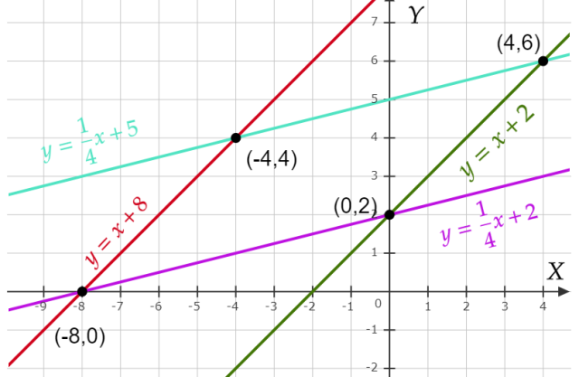 Współrzędne wierzchołków tego równoległoboku, to będą punkty przecięcia podanych prostych. Naszkicuj je wszystkie w jednym układzie współrzędnych. Przekształć każdą prosta do postaci kierunkowej, a następnie stwórz tabelki ze współrzędnymi dwóch punktów z każdej prostej. Wybierz w tym celu dwa dowolne argumenty i ze wzoru prostej wyznacz odpowiadające im wartości. Zaznacz te dwa punkty w układzie współrzędnych, a następnie stwórz prostą przechodzącą przez nie.