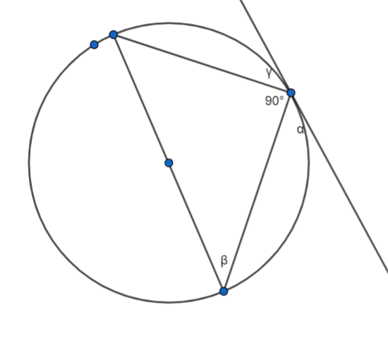 Kąt okręgu oparty na średnicy to zawsze kąt prosty. Kąty α, γ i kąt prosty dają razem 180˚, ponieważ są to kąty przyległe.