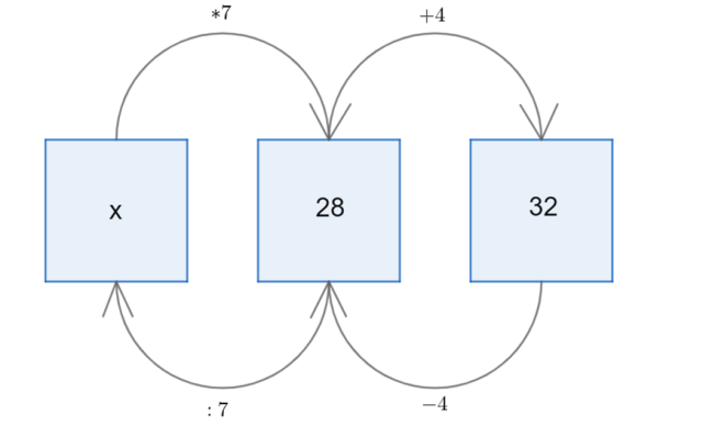 Niewiadomą najpierw pomnożono przez 7, a następnie powiększono o 5, zapisz te działania w takiej kolejności nad górnymi strzałkami. Wynikiem tych operacji jest liczba 32 – umieść ją w ostatnim polu. Na dolnych strzałkach wypisz działania odwrotne do tych, które znajdują się nad nimi i wykonuj je w odwrotnej kolejności (tak, jak prowadzą strzałki). Wynik dzielenia liczby 28 przez 7 to wartość szukanej liczby.