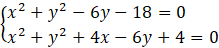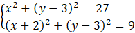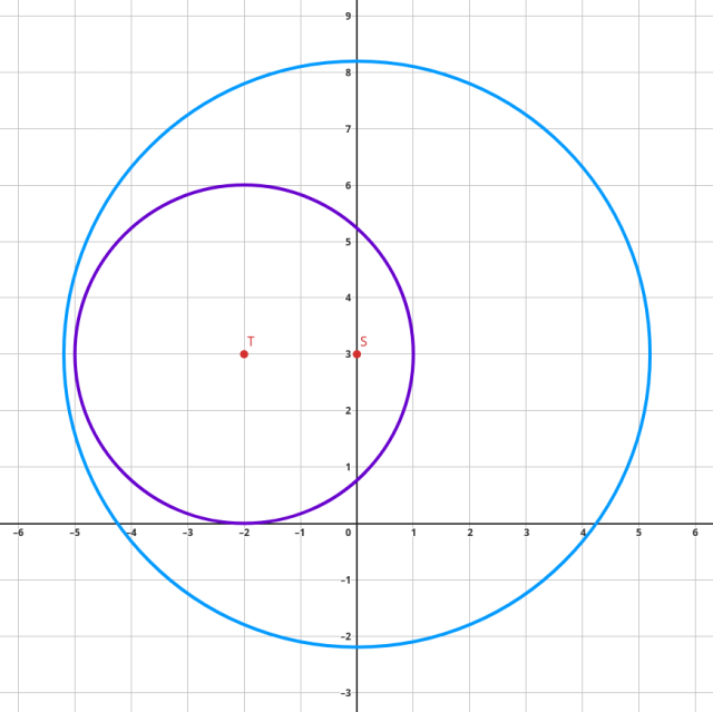 Ułóż układ równań z równań okręgów. Przeprowadź te równania do postaci ogólnej, a następnie dodaj stronami. Podstaw otrzymaną w ten sposób prostą do jednego z równań okręgów. W wyniku otrzymasz, że kwadrat liczby zależnej od 𝑦 jest równy liczbie ujemnej. Równanie nie ma żadnych rozwiązań; okręgi się nie przecinają. Równoważnie można pokazać, że okręgi są rozłączne wewnętrznie.