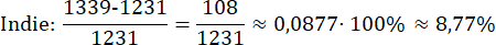 W tabeli przedstawiono liczby ludności trzech najludniejszych krajów świata (w milionach) w 2010 roku i w 2017 roku. Oblicz, o ile procent wzrosła liczba mieszkańców tych państw w latach 2010 - 2017.