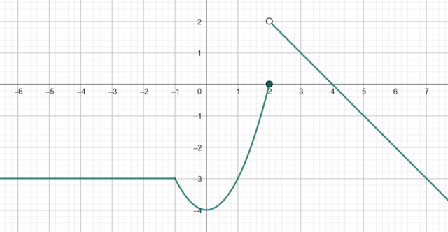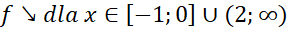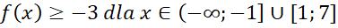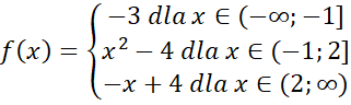 Narysuj podany wzór funkcji w każdym z przedziałów-. Następnie odczytaj z niego miejsca zerowe, przedziały monotoniczności oraz argumenty dla których wartości funkcji są większe lub równe 3.
