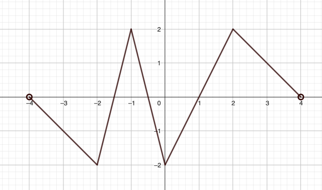 Funkcja maleje w przedziale (-4,-2), w przedziale (-1,0), w przedziale (2,4). Funkcja rośnie w przedziałach (-2,-1), (0,2).