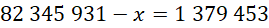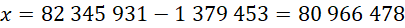 Aby obliczyć niewiadomą, zapisz odejmowanie, ponieważ 82 345 931 składa się z sumy x i 1 379 453.