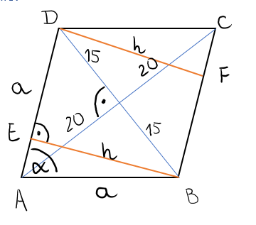 W tym zadaniu musisz obliczyć pole prostokąta DFBE wiedząc, że przekątne mają długość 30 i 40, kąt ostry rombu przy wierzchołku A jest równy oraz poprowadzono wysokości BE i DF, , .