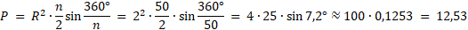 Oblicz pole 50-kąta foremnego wpisanego w okręg o promieniu 2.
