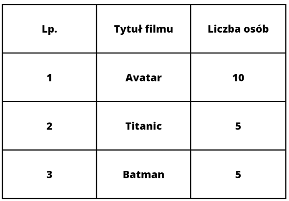 W tym zadaniu przeprowadź ankietę na temat ulubionego filmu obejrzanego w ostatnim roku szkolnym i opracuj jej wyniki.