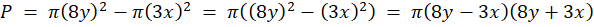 Od pola dużego koła o promieniu 8y odejmij pole mniejszego o promieniu 3x. Następnie wyciągnij wspólny czynnik przed nawias i skorzystaj ze wzoru skróconego mnożenia