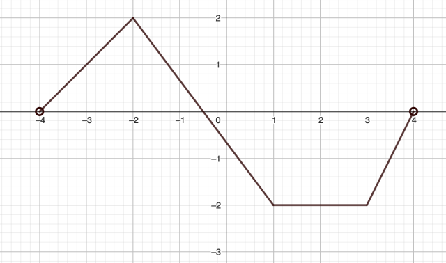 Funkcja maleje w przedziałach (-2,1), funkcja rośnie w przedziałach (-4,-2), (3,4), funkcja jest stała w przedziale (1,3)