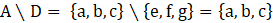 Zbiór A nie ma części wspólnej ze zbiorem D, ponieważ mają wszystkie elementy różne, przez co nie ma czego odrzucić ze zbioru A. Wszystkie elementy zbioru A nie należą do zbioru D.