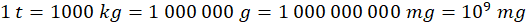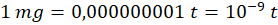 W tym zadaniu wstaw w luki odpowiednią potęgę liczby 10: 1 t = … mg, 1 mg = … t.