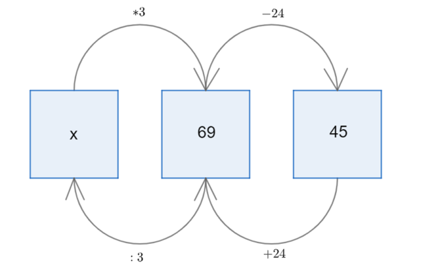 Niewiadomą najpierw pomnożono przez 3, a następnie pomniejszono o 24, zapisz te działania w takiej kolejności nad górnymi strzałkami. Wynikiem tych operacji jest liczba 45 – umieść ją w ostatnim polu. Na dolnych strzałkach wypisz działania odwrotne do tych, które znajdują się nad nimi i wykonuj je w odwrotnej kolejności (tak, jak prowadzą strzałki). Wynik dzielenia liczby 69 przez 3 to wartość szukanej liczby.