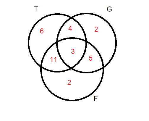 Diagram z ilościami osób na poszczególnych zajęciach znasz z podpunktu a). Dodaj do siebie liczbę osób, które chodzą na tylko na gitarę i fotografię oraz tylko na gitarę i taniec.