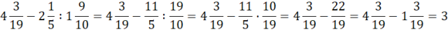 Pamiętaj o kolejności wykonywania działań: pierwszeństwo przed odejmowaniem ma dzielenie. Zapisz dzielną i dzielnik jako ułamki niewłaściwe, a następnie zamień dzielenie na mnożenie przez odwrotność drugiego ułamka. Na koniec zapisz wynik mnożenia w najprostszej postaci i wykonaj odejmowanie.