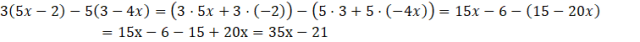 W tym zadaniu musisz przemnożyć nawiasy przez 3 i 5, a następnie zredukować wyrazy podobne.